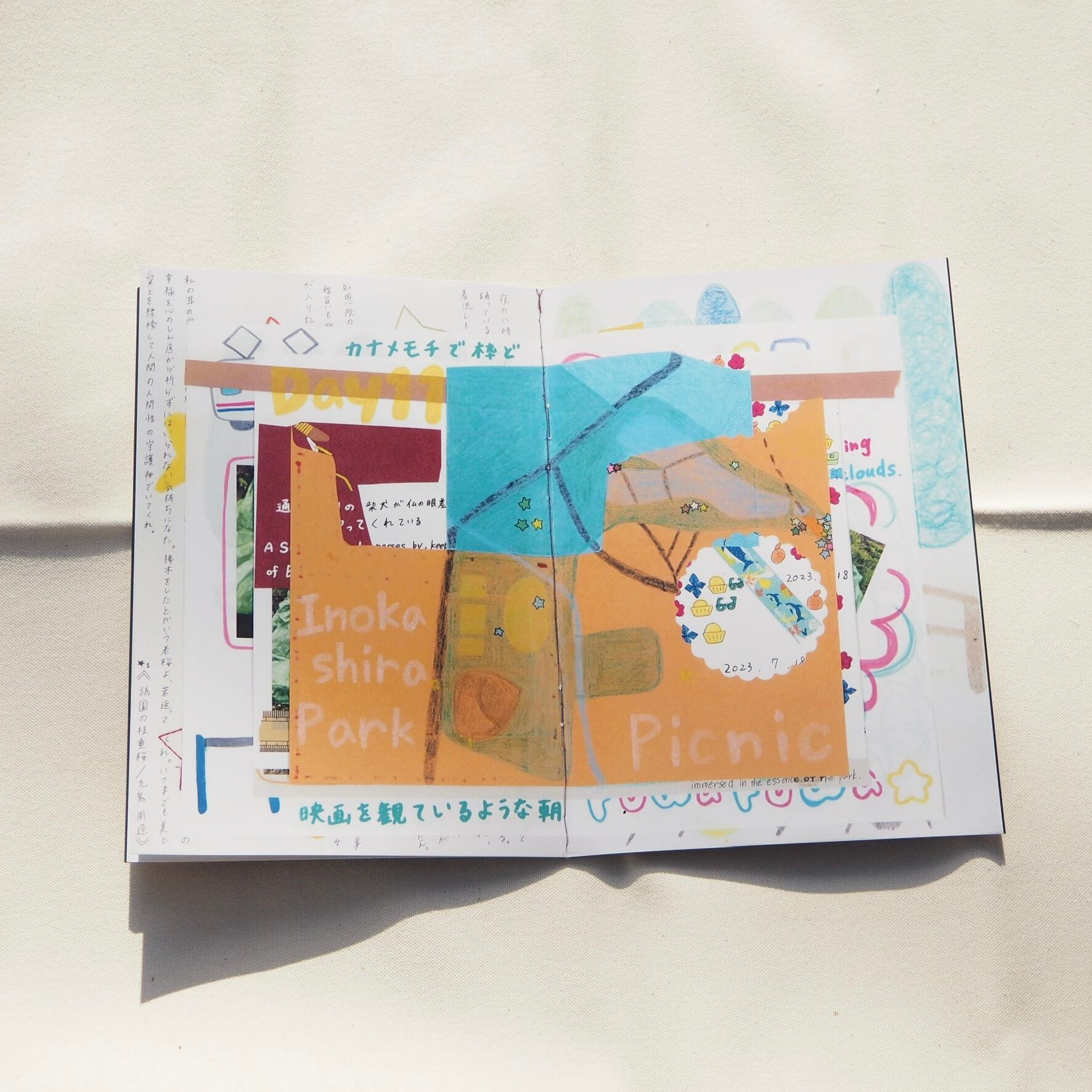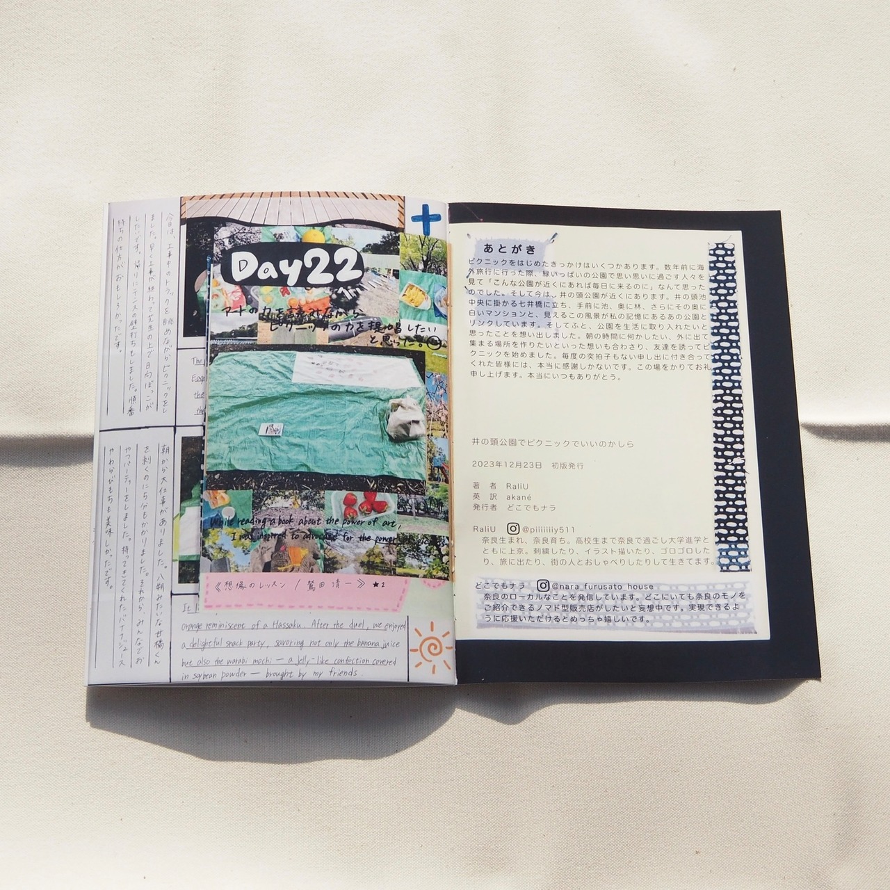 全32ページのPicnic ZINE。2023年春から夏にかけて週1回行った、井の頭公園でのピクニックを記録したZINE。半年間続けて、大きな時間の流れと日々の時間の流れを感じた。過ぎゆく日常の中で、ピクニックはふらっと訪れたすきまになっていた。
