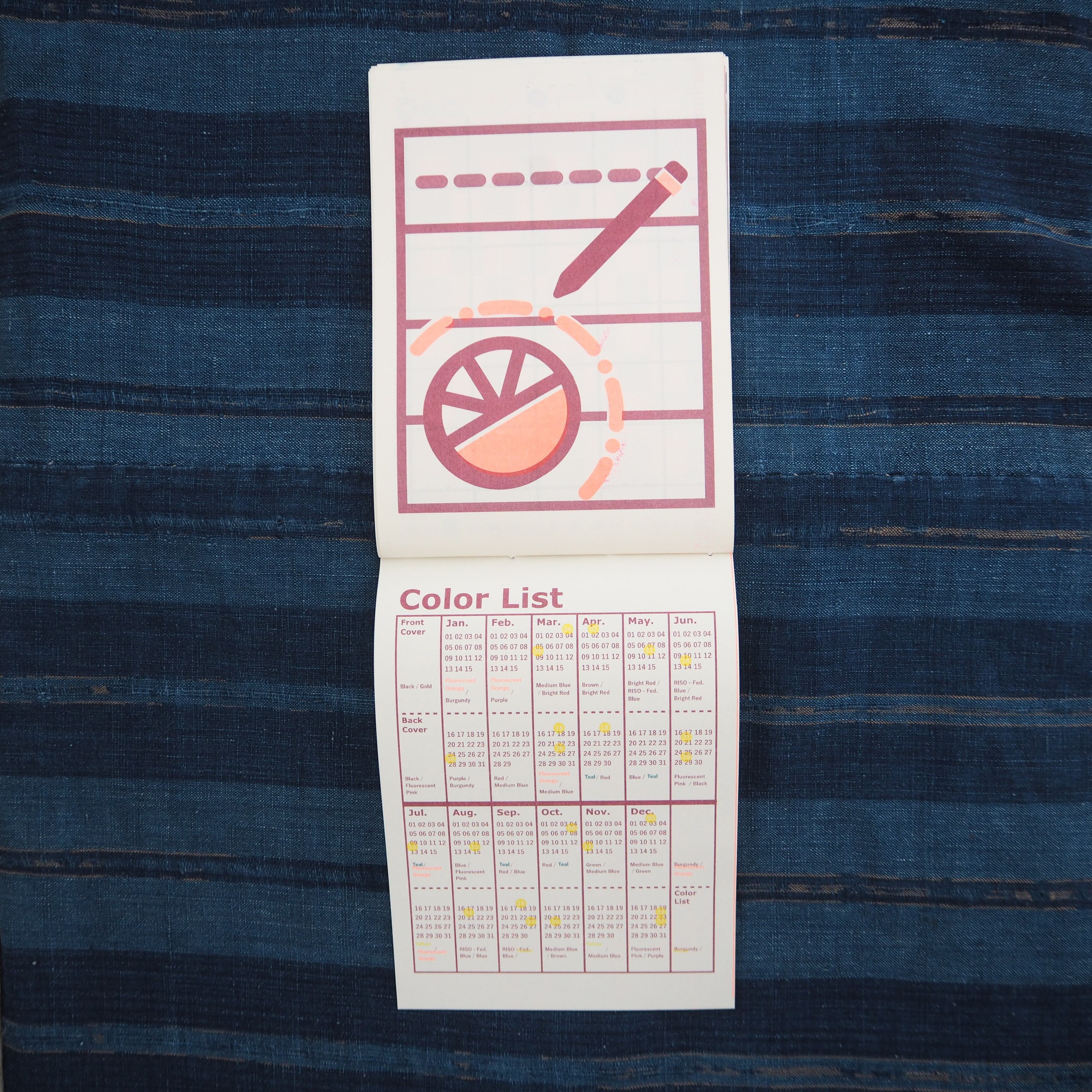 通念使えるカレンダーをRISOGRAPHで刷りました。シェアハウスで出会った人たちをイメージして書いたイラストで毎月を彩っていただければ幸いです。RISOGRAPHの色味表も添付しています。